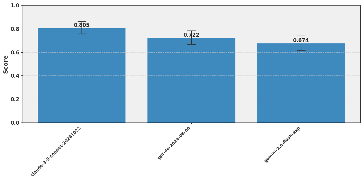 We ran the final eval on 10 different models (5 times on Gemini 1.5 Pro, Claude 3.5 Sonnet and GPT-4o, once for the others) and got the following results: