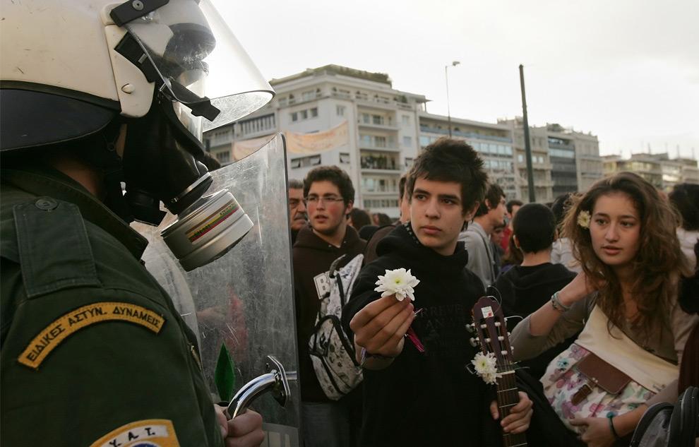An unknown student offers flowers to riot police during the Greek 2008 protests. http://archive.boston.com/bigpicture/2008/12/2008_greek_riots.html