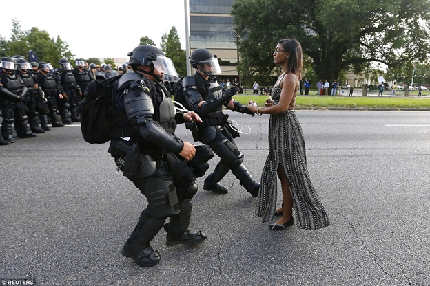 Iesha Evans is arrested while protesting the shooting of Alton Sterling. https://en.wikipedia.org/wiki/Taking_a_Stand_in_Baton_Rouge