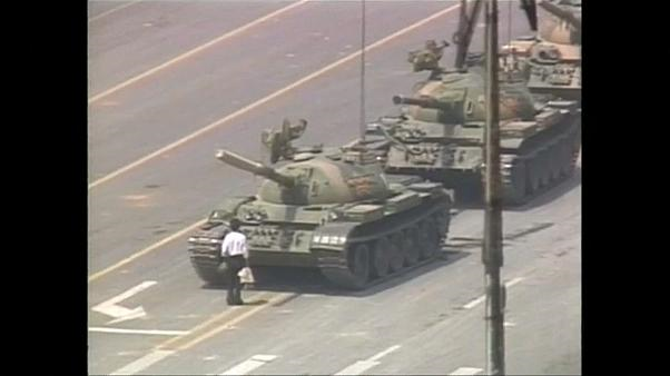 An unknown protester blocks tanks in Tiananmen Square. https://en.wikipedia.org/wiki/Tank_Man