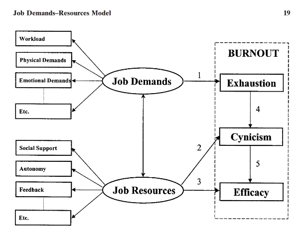 By far the most popular model of burnout in the literature is “Job Demands—Resources”, or “JD-R”, which posits that high job demands lead to exhaustion, and low resources lead to cynicism and feelings of low personal efficacy. “Demands” and “Resources” are defined fairly broadly here. Demands includes things like “coping with conflicting goals” and resources includes things like chances for advancement.