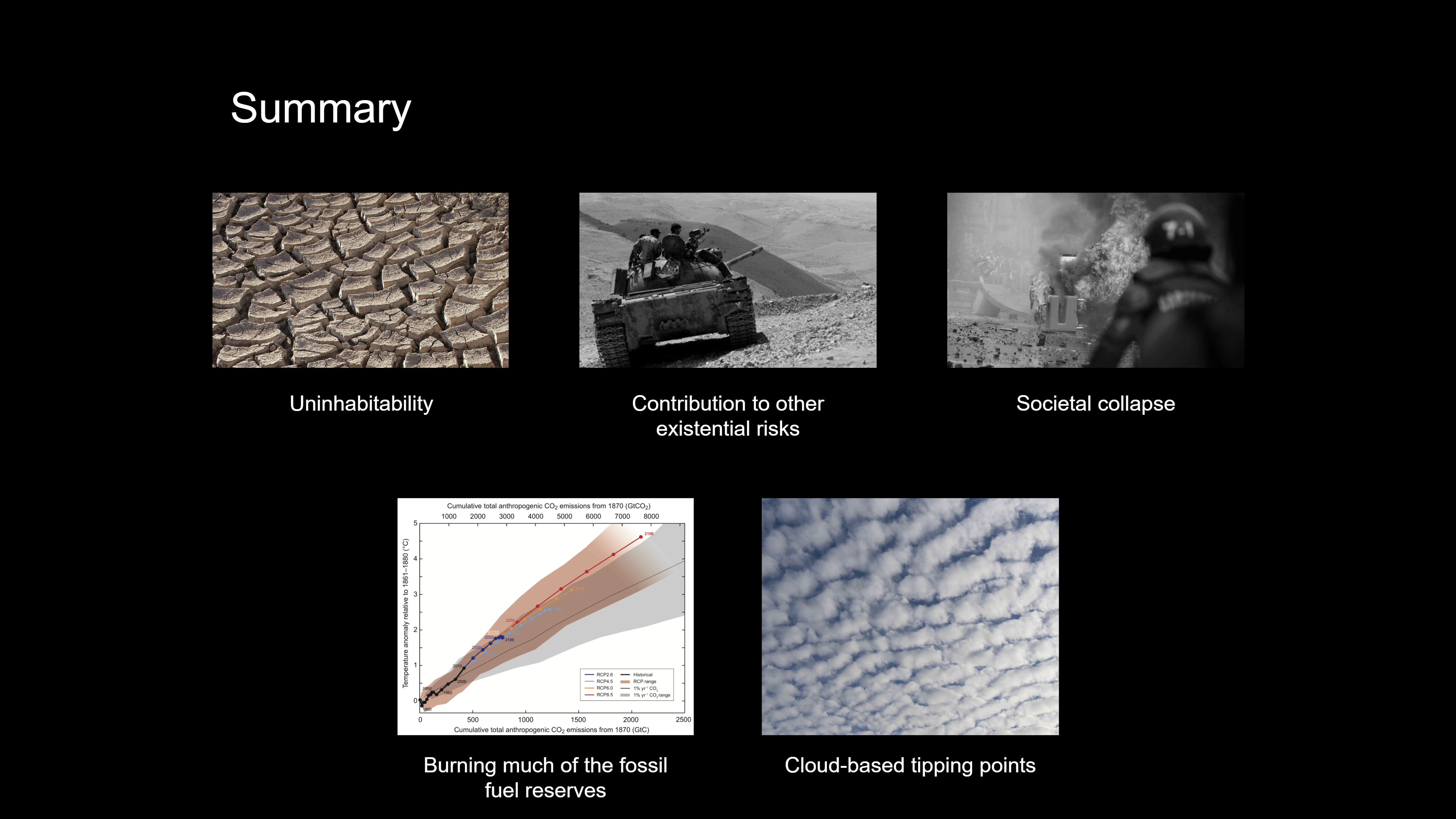 Niel concludes by summarising the points raised, that climate change contributes to existential risk through the three routes described above, and that the second and third are probably the larger terms.
