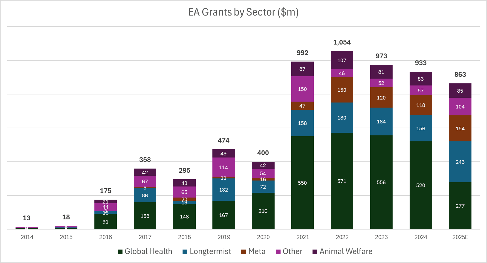 Updated OpenPhil figures for 2024 and 2025 to align with this, better reflecting wonât-be-published and yet-to-be-published grants (note this means they are really not comparable with earlier years)