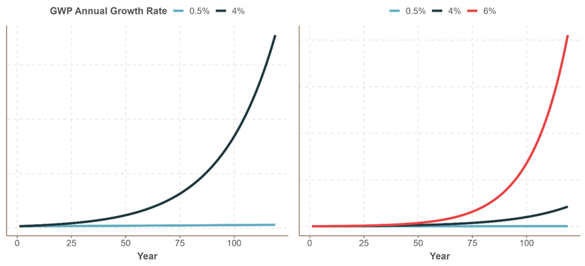 Relative GWP growth comparison of pre- and post-Industrial Revolution (0.5% and 4%, left) and required GWP growth to quality AGI (6%, right) over an arbitrary 120-year timeline.