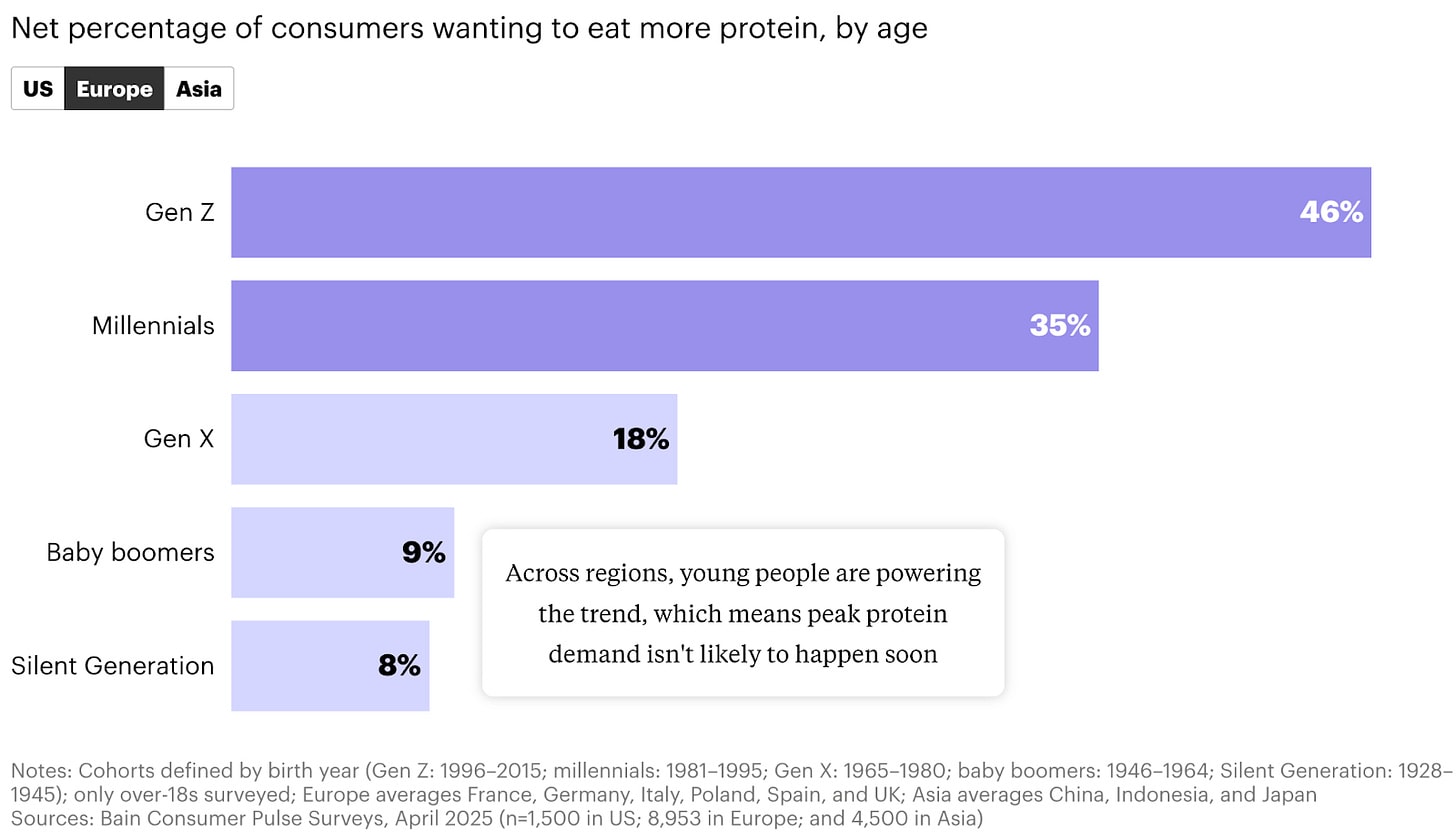Young people are leading the charge. Across Asia, Europe, and the US, most Gen Z’ers want more protein, suggesting this trend may persist. In one recent British university survey, “protein” was the top reason students gave for not giving up meat. Doctors are also telling the 6 − 10% of Americans now taking GLP-1 weight loss drugs to eat more protein to prevent muscle loss.