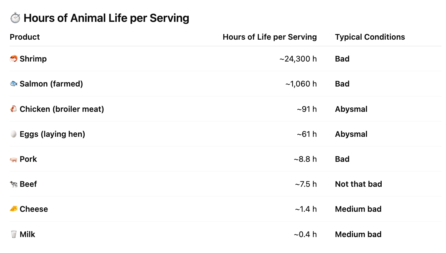 Lifespan: farmed fish like salmon grow slowly, living 1-2 years — much longer than most farmed animals. They’re also small. So one salmon serving can require over 1,000 hours of animal suffering. (Wild-caught salmon suffers less, but buying it likely increases demand for farmed salmon since wild stocks are supply-limited.)