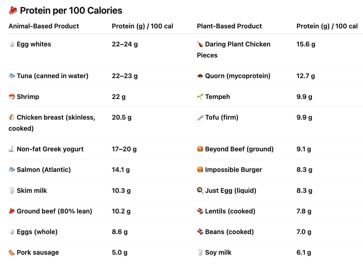 For (potential) vegans that are depressed at the sight of the protein/kcal table. Here’s a screenshot of a similar table I put together last year (for myself—UK based). I like sharing this with gym bros that scoff at veganism for lean protein reasons.