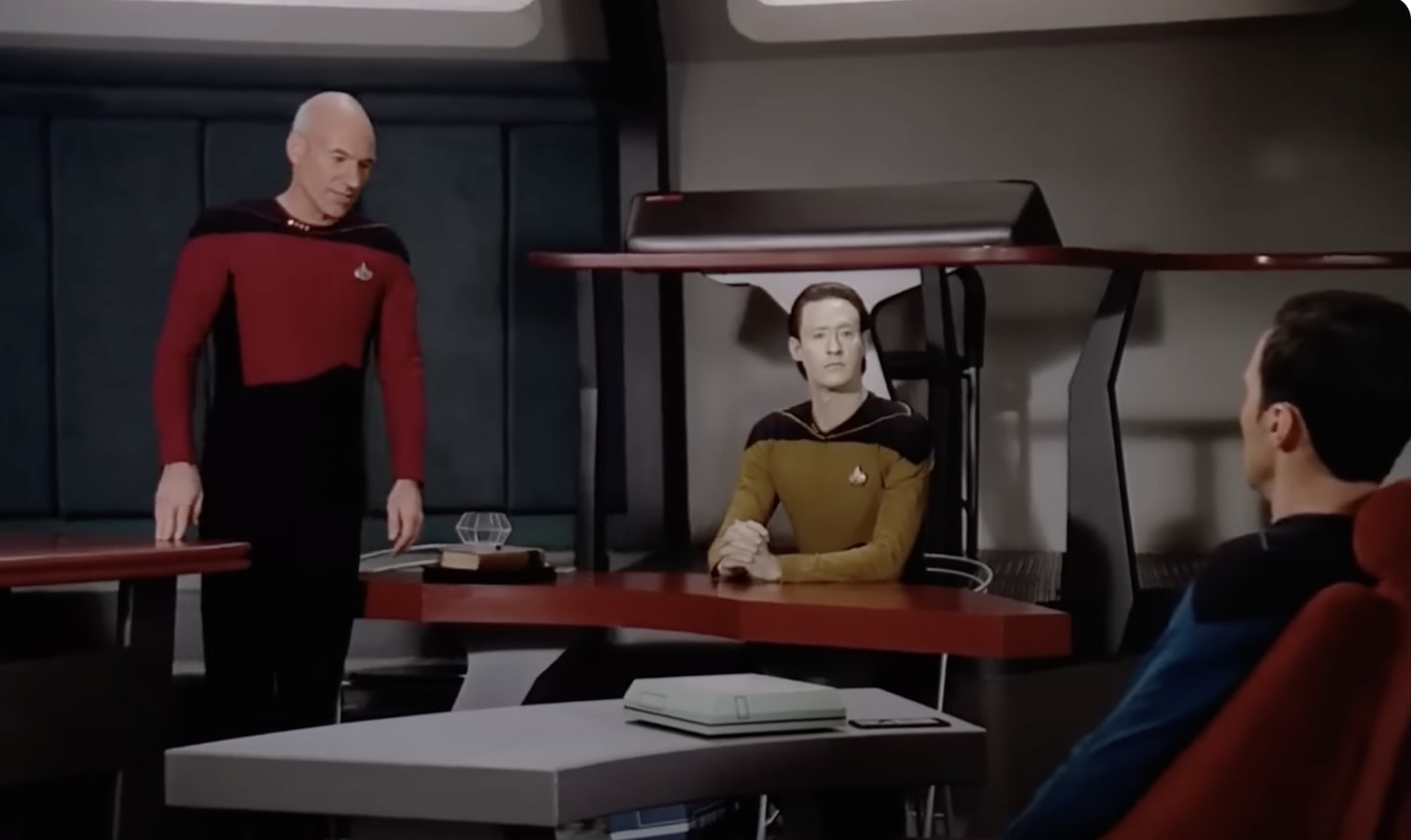 The episode is called “The measure of a man.” But who is being measured? The show isn’t subtle about the double meaning. Nor: about the right answer. At one point, when it looks like he’ll lose the case, Picard consults the bartender, Guinan. She speaks with quiet intensity.