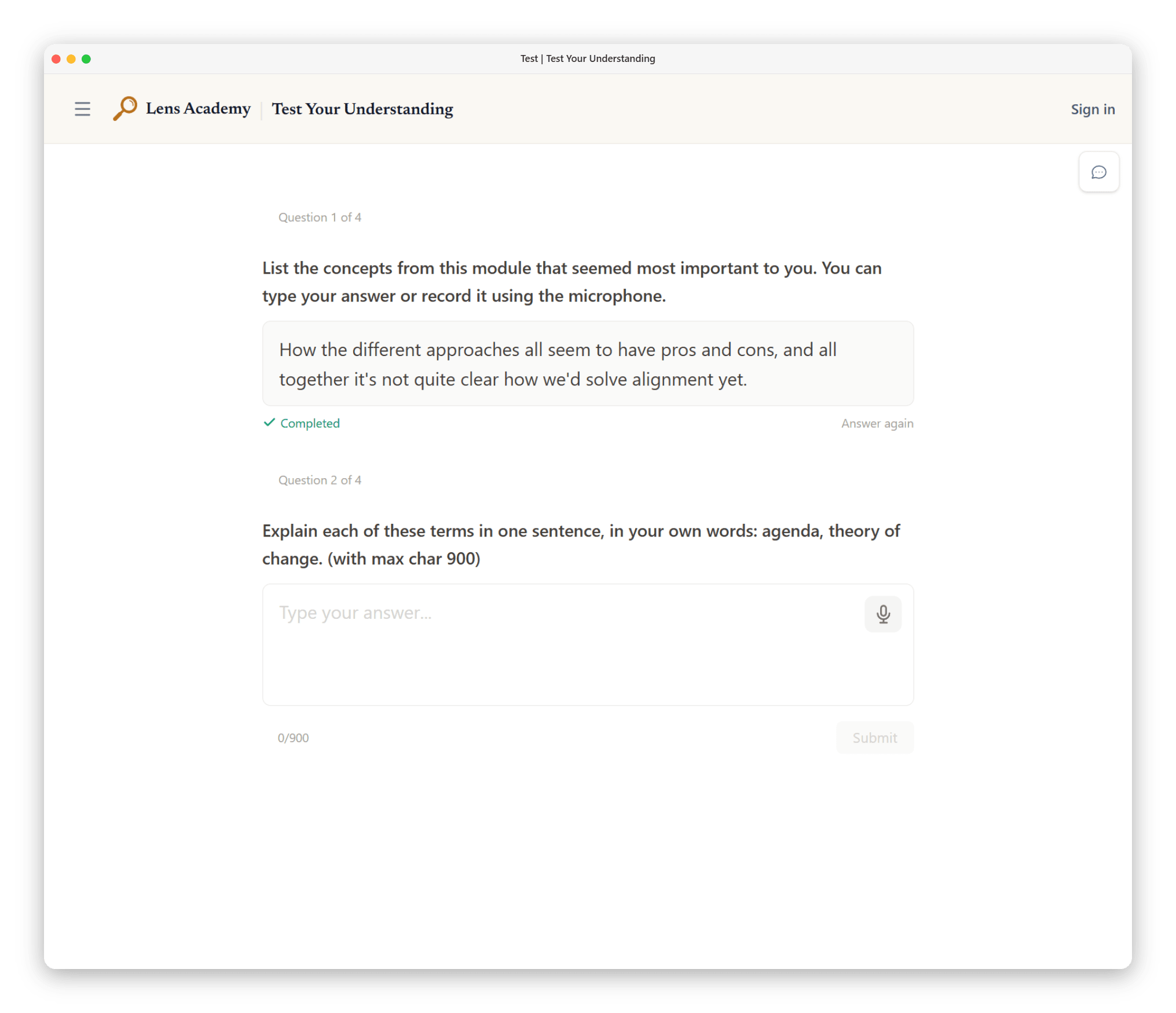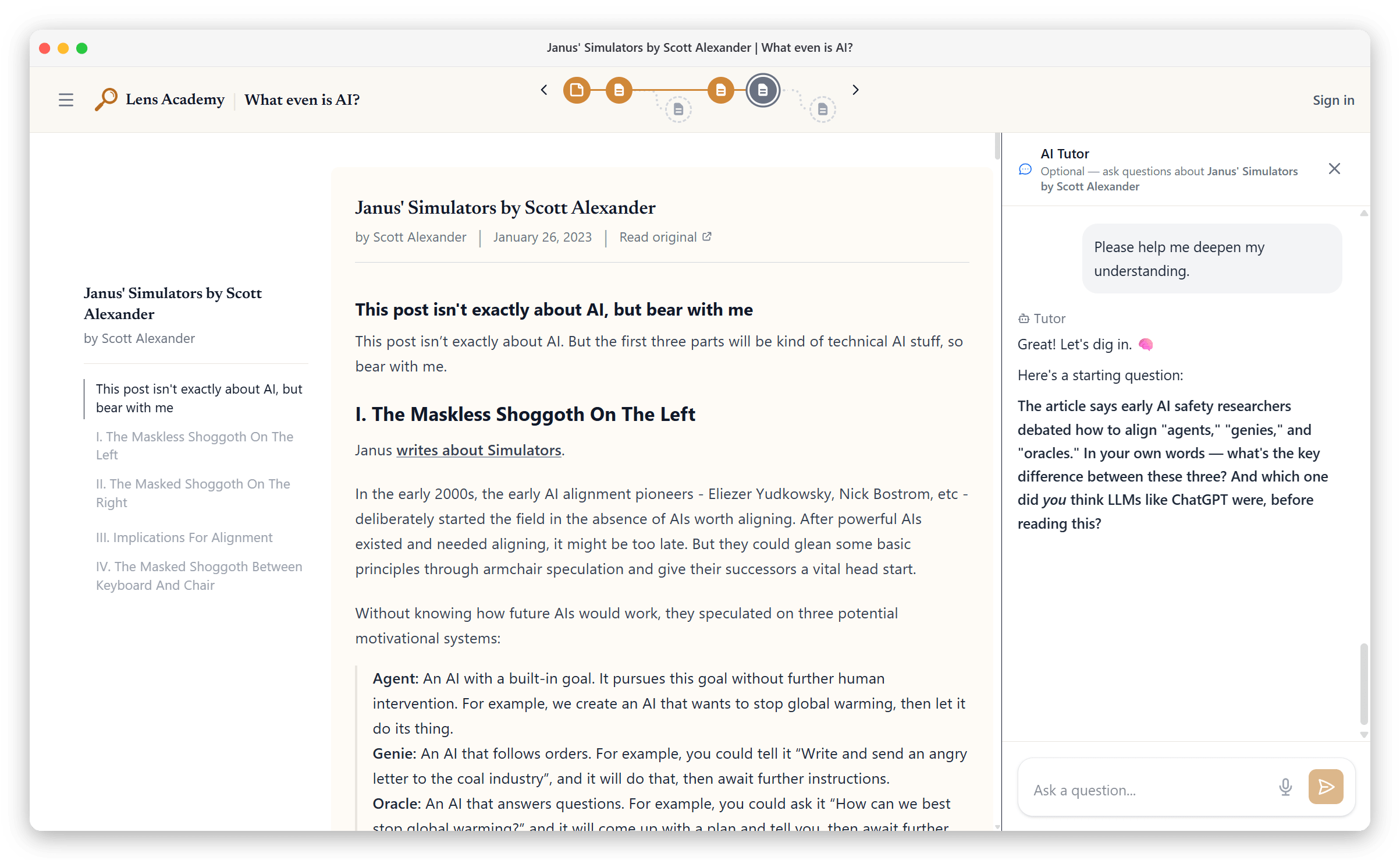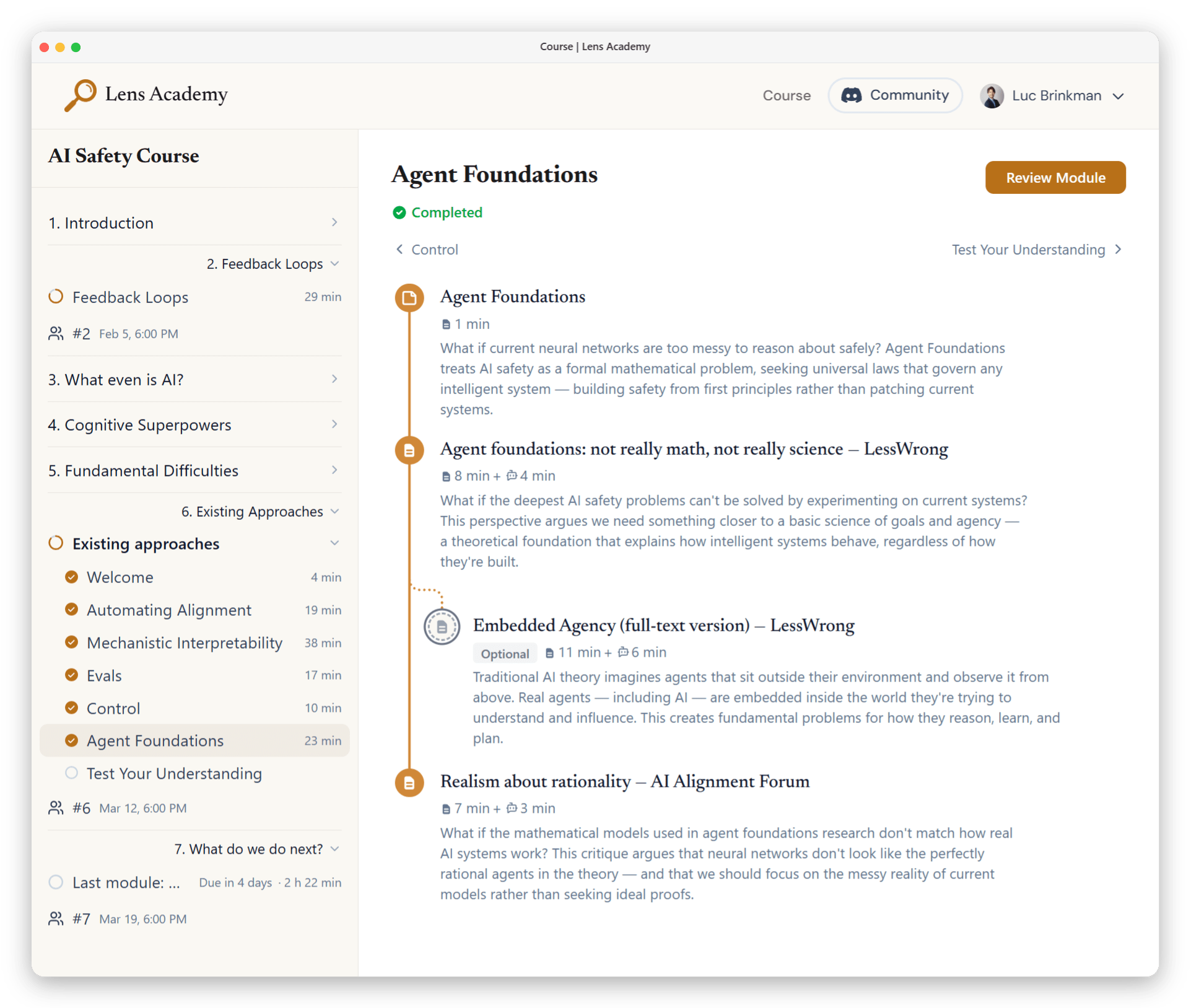 We started Lens Academy to close that gap. Lens Academy is a free, nonprofit AI Safety education platform focused specifically on misaligned superintelligence: why it’s the central risk, why alignment is hard, and how to think about what to work on.