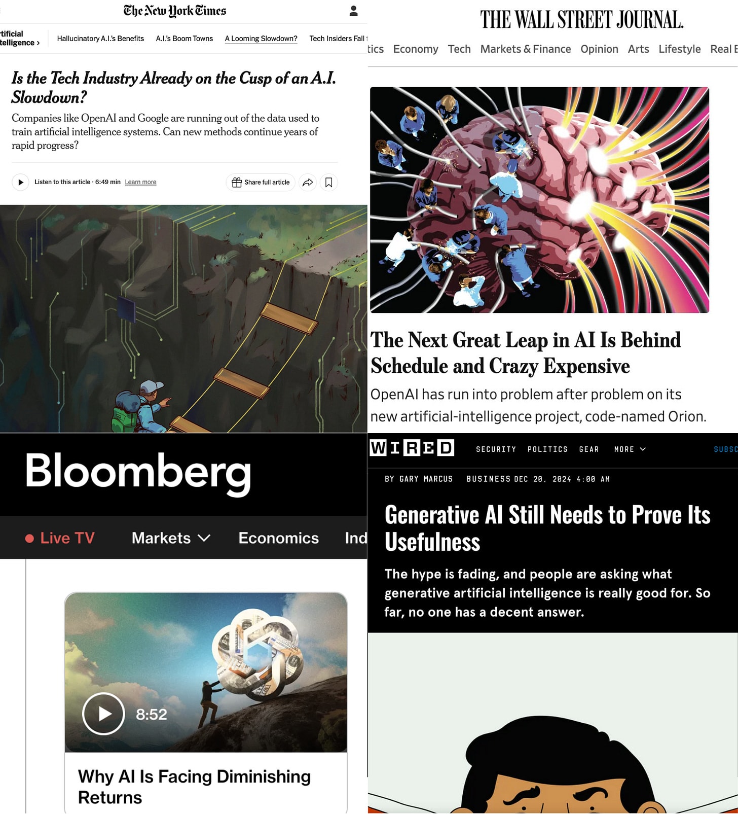 In fact, the day after the o3 announcement you could find headlines in the NYT, WIRED, WSJ, and Bloomberg suggesting AI progress was slowing down!