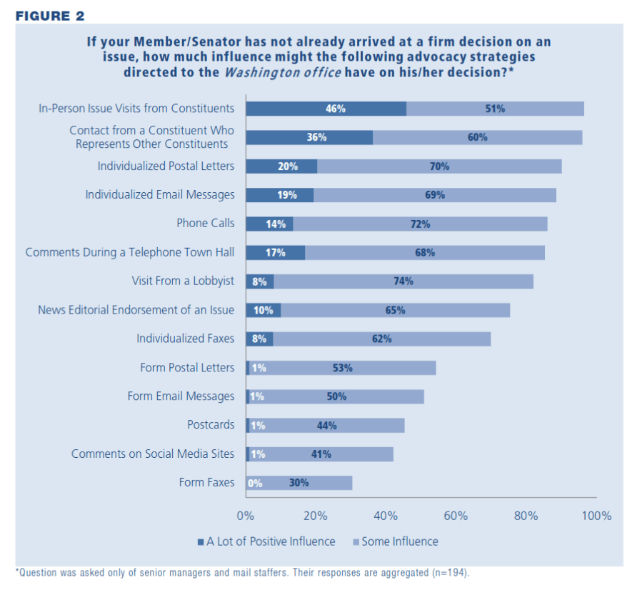 An article from the OpenGov Foundation has a more qualitative perspective, with quotes from legislators about what kinds of advocacy they care most about.