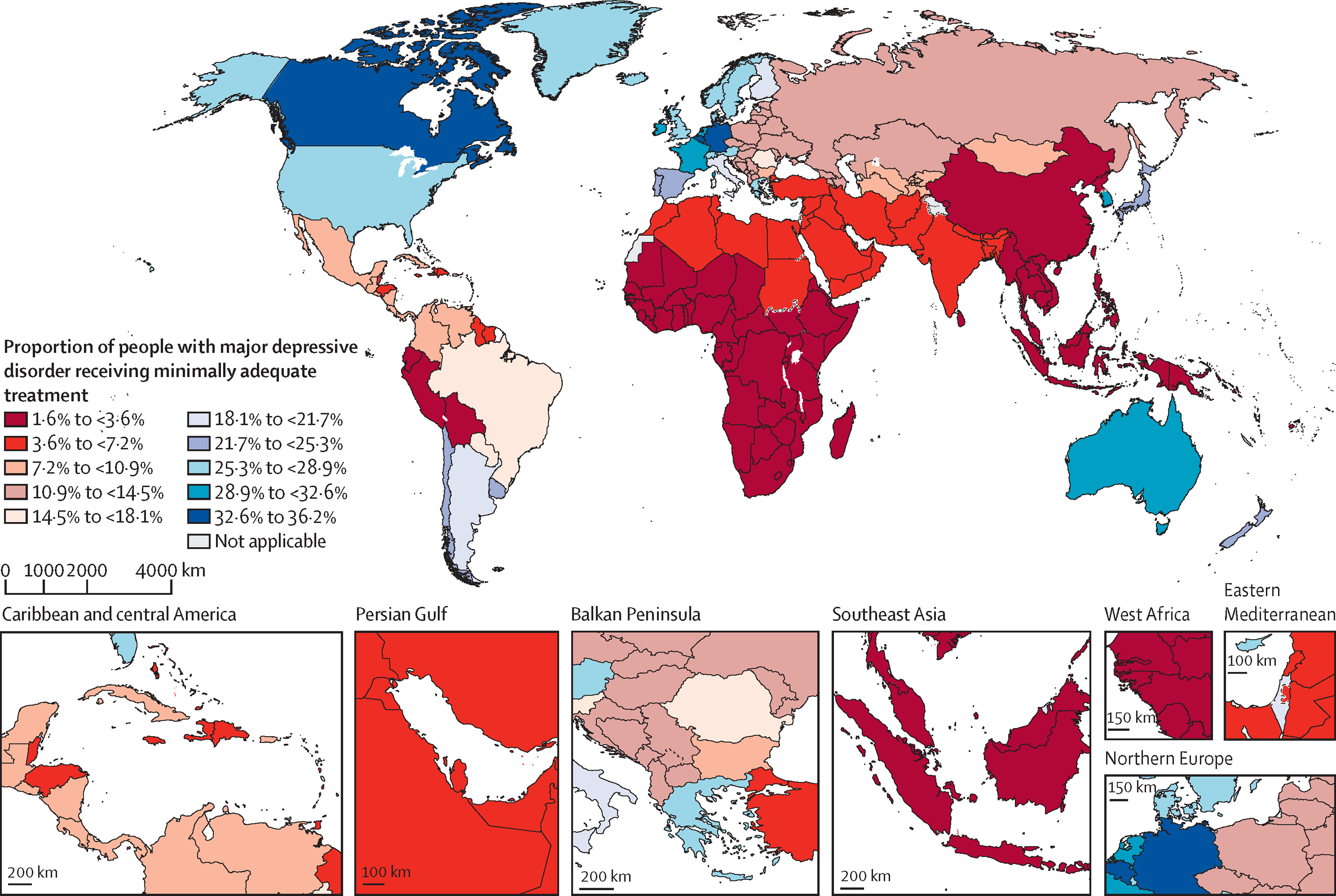 It seems like this should be normalized by total population. If a country only had one depressed dude, and he was untreated, I would say this is a small gap, but the map as it is would suggest it was the largest possible gap. Conversely, if every single person in the country was depressed, and only 33% were treated, this map would suggest the gap was very small.