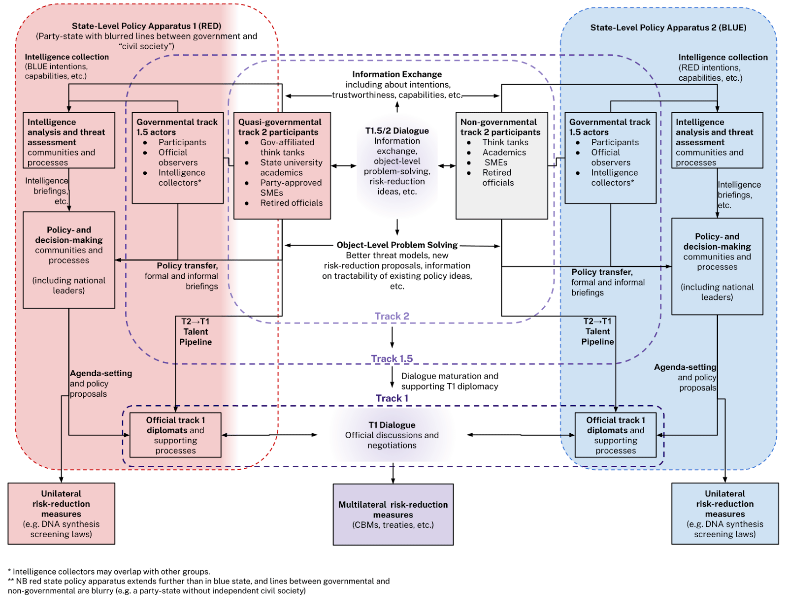 Organizers of dialogues have explained that this kind of intelligence collection and subsequent briefing of host governments are understood and expected.[22] Both sides tend to have an unspoken agreement that they will be briefing their country’s officials, even if no officials are present at the dialogue — as discussedbelow, this suggests that the border between “track 2” and “track 1.5” is fuzzy. For example, an official participating in U.S.-China track 2 dialogues on AI-bio risks (funded by Founders Pledge’s GCR Fund) recently told DefenseScoop that