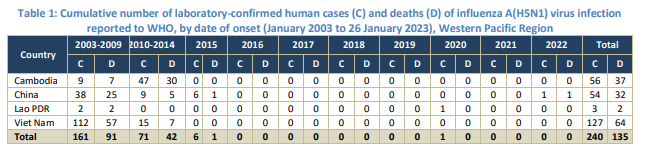H5N1 has popped up sporadically throughout the world, but not in simultaneous community spread characteristic of an oncoming pandemic. Per the WHO, “Globally, from January 2003 to 25 November 2022, there have been 868 cases of human infection with avian influenza A(H5N1) virus reported from 21 countries. Of these 868 cases, 457 were fatal (CFR of 53%).”