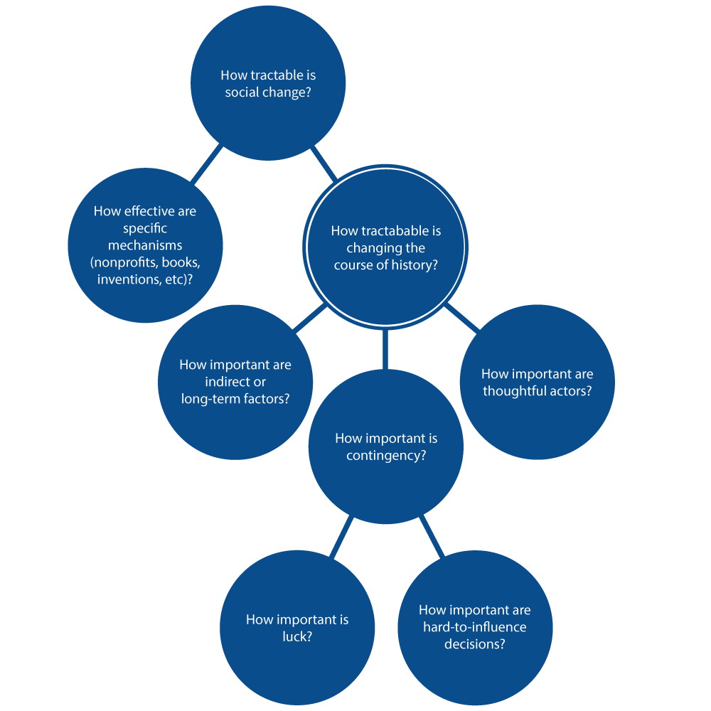 Fig. 1. Sub-questions of “How tractable is social change?” Note that the subquestion, “How tractable is changing the course of history?” is the subject of this blog post.