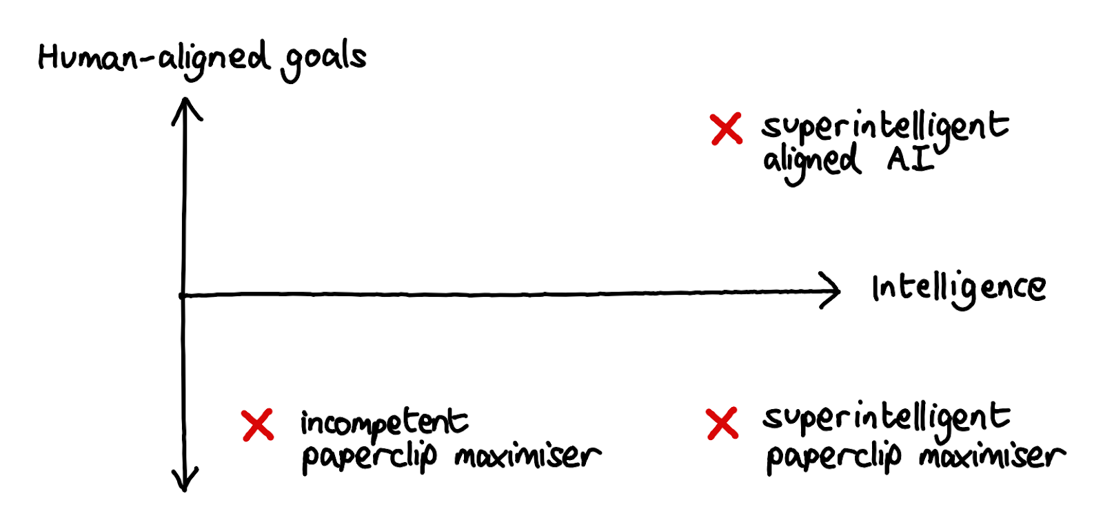 Here, orthogonal means “at right angles” or “unrelated” – in other words we can imagine a graph with one axis representing intelligence, and another representing the agent’s goals, with any point in the graph representing a theoretically possible agent[1]. The classic example here is a “paperclip maximiser”—a powerful AGI driven only by the goal of making paperclips.