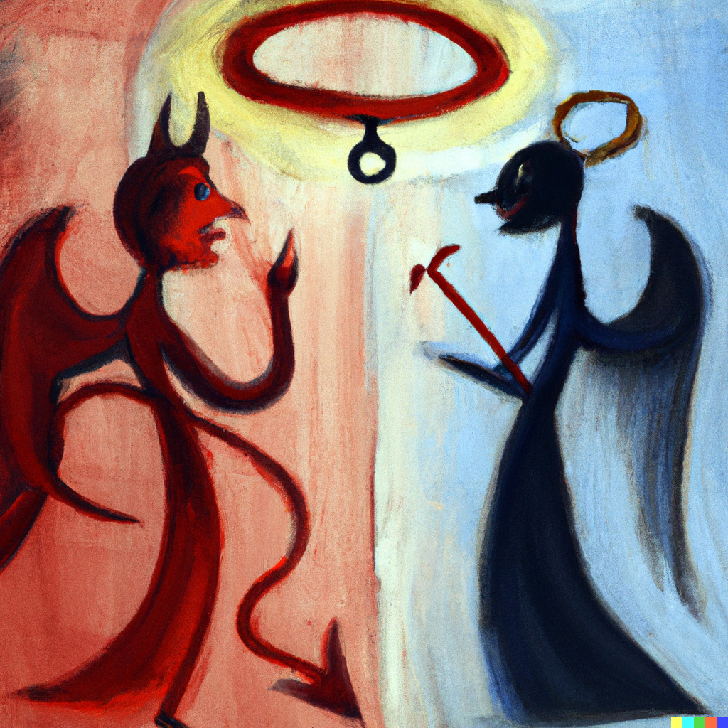 Two arguments between an angel and a devil, one inside a circle and one on the outside, painting