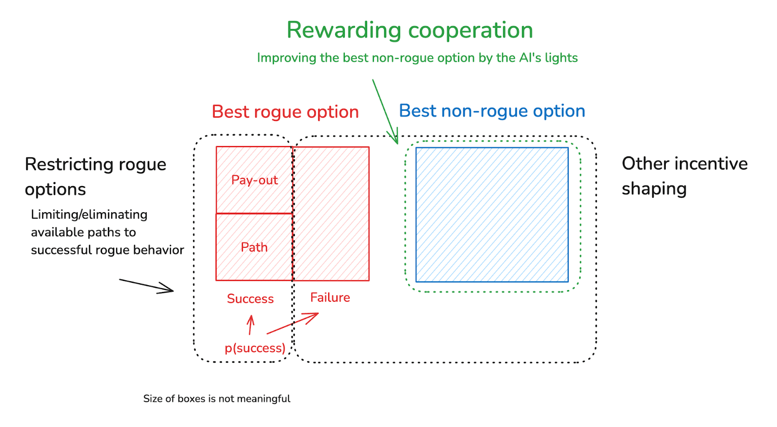 Other incentive shaping. The second tries to positively shape an AI’s incentives in some other way – for example, by improving the AI’s best non-rogue option so that its satisfaction is higher.