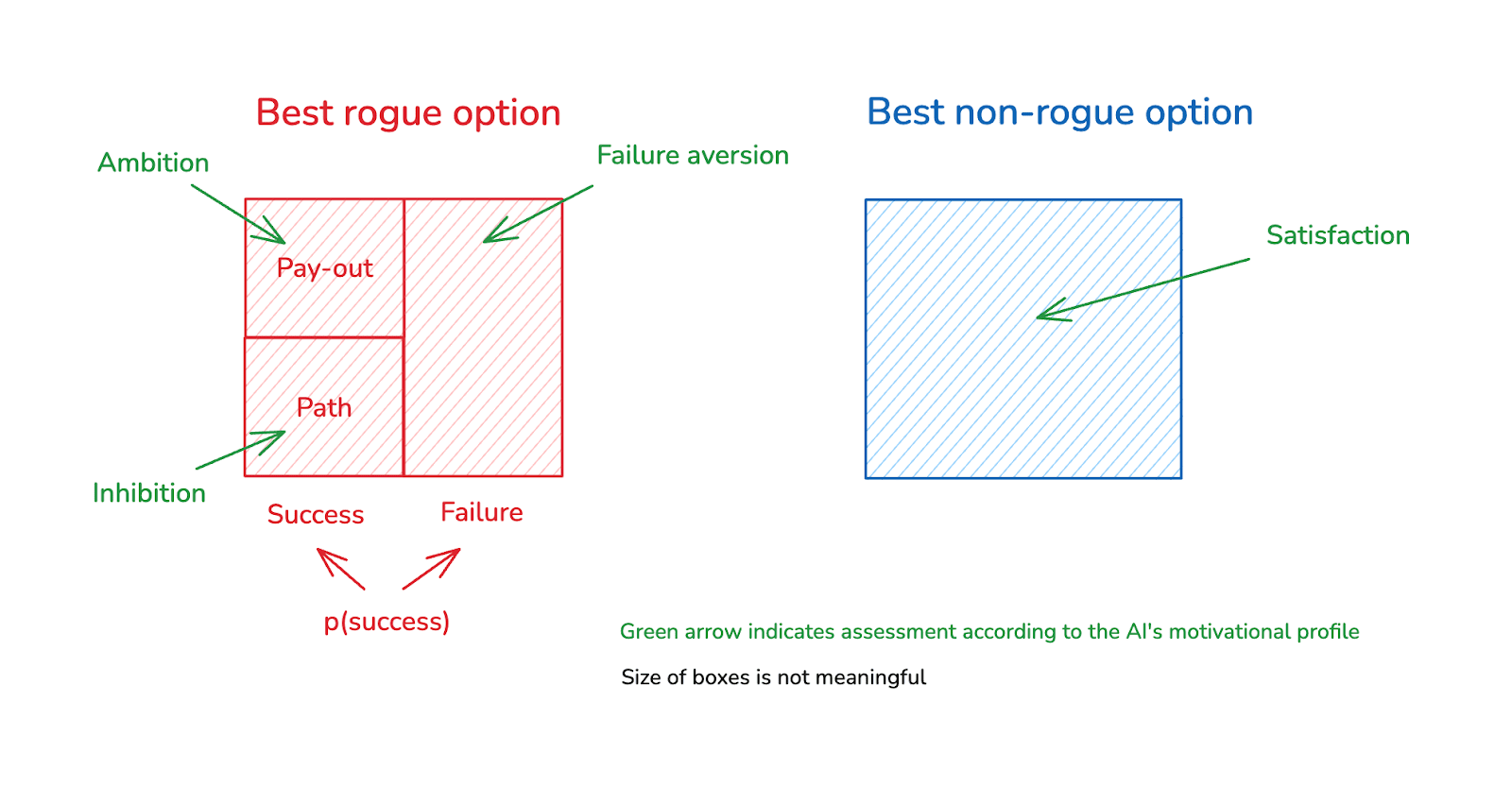 Recall the framework I introduced in my second essay for thinking about the incentives at stake in an AI’s choice to go rogue. On this framework, such a choice happens when the AI’s best rogue option beats its best non-rogue option. An AI’s assessment of its best rogue option depends on both the nature of that option (e.g. the probability-weighted paths to success, the probability of success vs. failure), and on motivational factors like how much it wants the power it gets if it succeeds (ambition), how much it dislikes various paths to success (inhibition), and how much it dislikes what happens if it fails (failure aversion). And similarly, an AI’s assessment of its best non-rogue option depends on both the nature of that option (what happens in expectation if the AI stays non-rogue in the relevant way) and how satisfied the AI is with that.