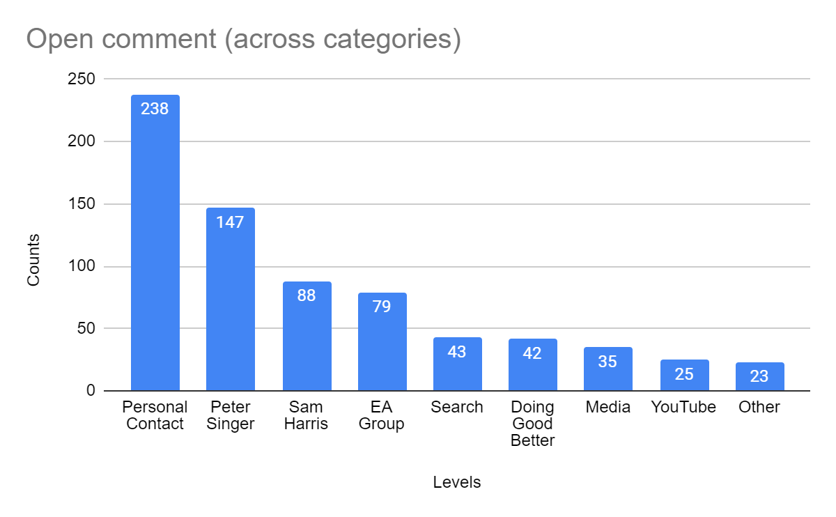 Notably, if we look at the EAS open comment data which I mentioned here, we can see that when Peter Singer references are counted as a single category, he’s among the top-mentioned. 80,000 Hours don’t appear among the top mentions in this analysis, most likely because they were a fixed category and respondents didn’t feel the need to select 80,000 Hours and then write “80,000 Hours” in the further details box (personal contacts and EA groups often appeared in the further details of other categories, in contrast).