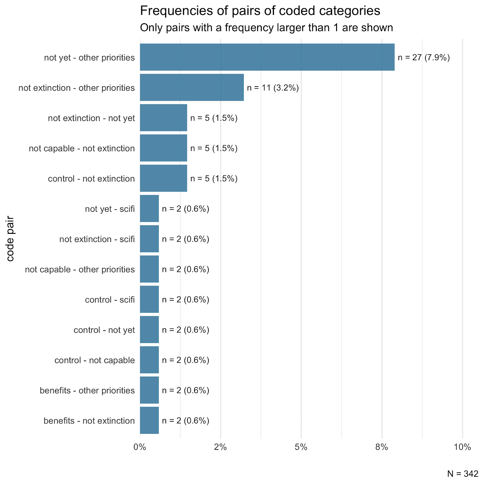 Responses could be coded as instantiating multiple different themes at once. We coded comments based on their specific content, rather than potential logical implications of what was stated. For example, a statement that “AI is nothing to worry about”, might be taken to imply the belief that AI won’t cause extinction, but it would not be coded as ‘Not extinction’ due to the lack of explicit content suggesting this.