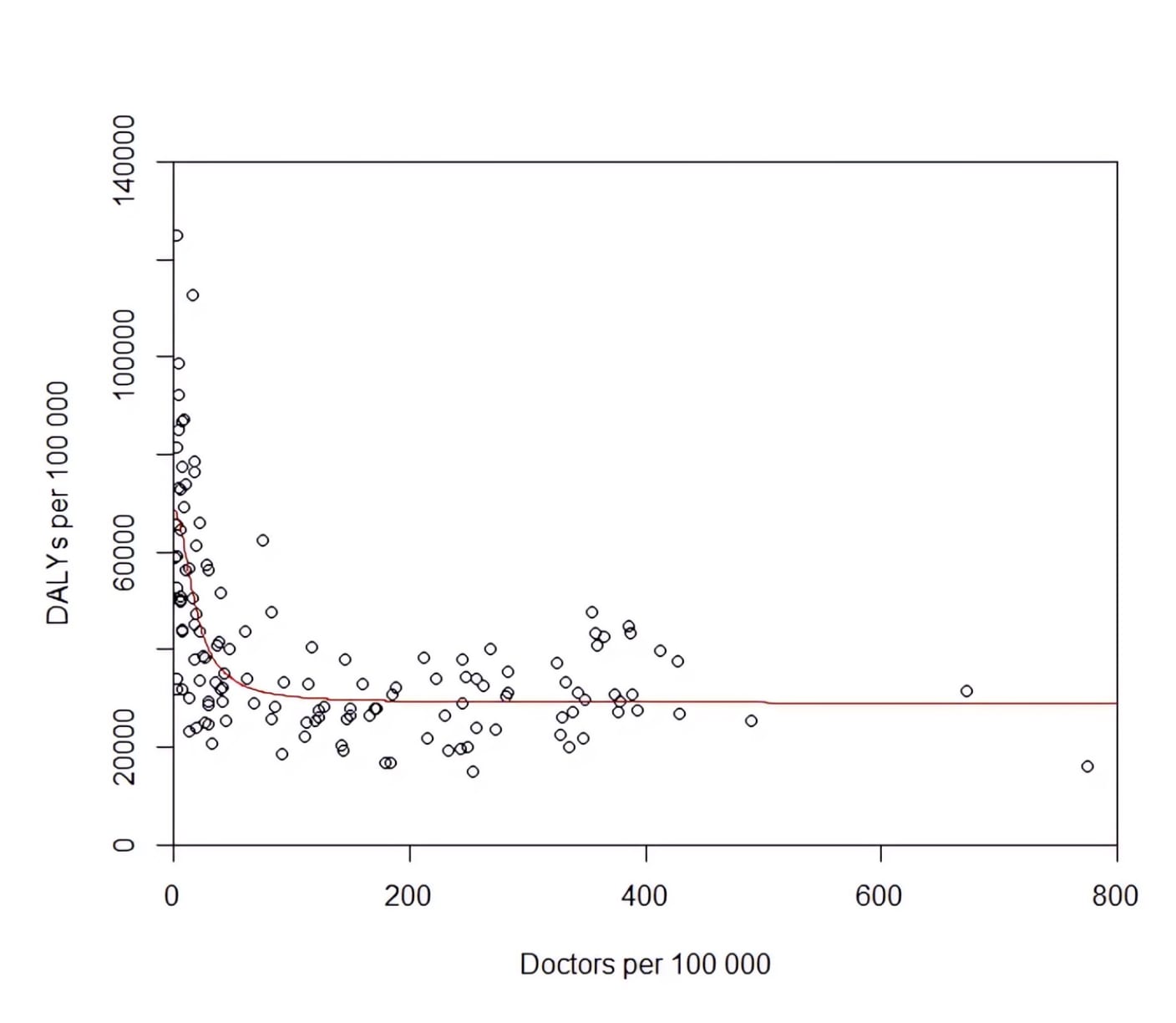 Look at this graph, from the analysis by Dr. Greg Lewis we quoted earlier. Each point is a country — The vertical axis shows disability-adjusted-life-years per 100-thousand people. You can think of that figure as roughly how many years of disability a group of 100-thousand people has to endure on average. Therefore, the fewer, the better. Each country has a different figure. The horizontal axis shows the number of doctors per 100-thousand people in each country. As you can see, countries with more doctors suffer lower disability.