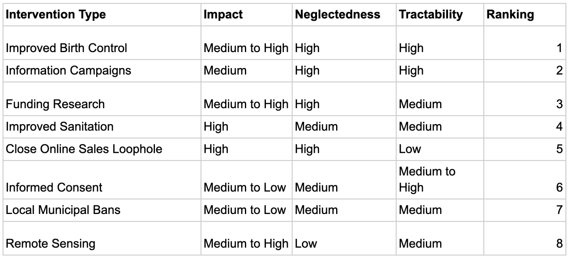 Table 1: A summary of the overall ranking of the 10 interventions types analyzed above. We scored Impact, Neglectedness, and Tractability holistically using High (5), Medium-High (4), Medium (3), Medium-Low (2), and Low (1), which were converted to a 5-point scale. The rankings in the right-most column are a result of adding up the numeric values that Intervention Type received in Impact, Neglectedness, and Tractability. Ties were resolved by holistically considering which intervention we believed was overall higher priority.