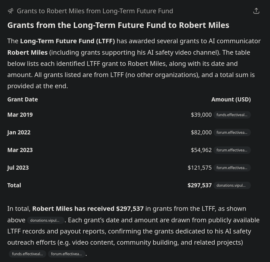 The Donations List Website indicates Rob has received ~$300k across 3 years from the LTFF. Since Rob has been making videos for ~10 years, I am estimating it takes ~$100k/year for a total of $1M. I used my scraper and estimated here of ~33% average watch time of video per view for ~31.6M viewer minutes. I will update this one as soon as Rob responds to me, since Rob is considered the canonical AI safety YouTuber.