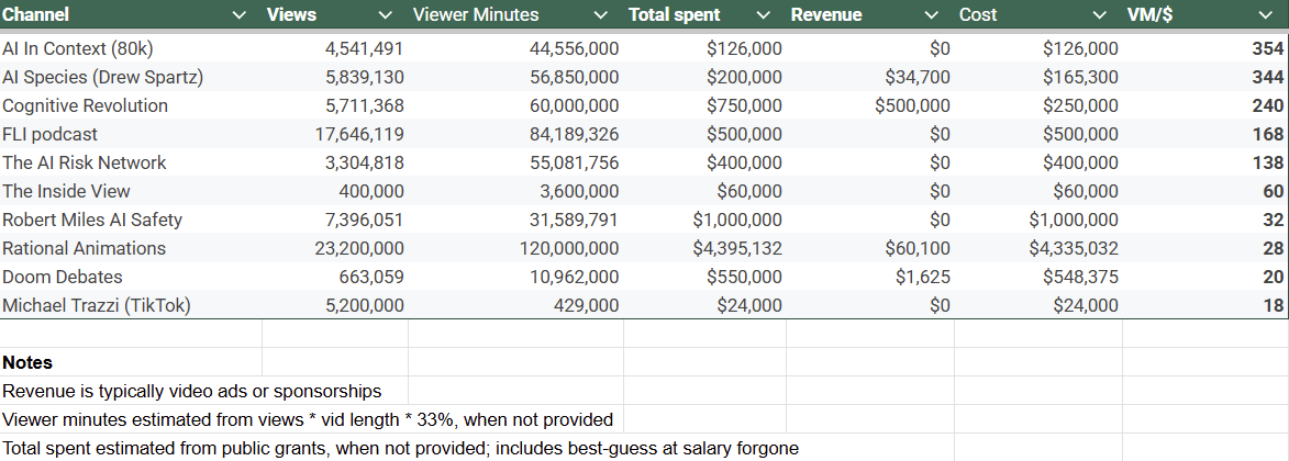 Some channels and podcasts also produce revenue through ads and sponsorships. This is a very good thing and is a sign that people want to see the content. In fact, I expect the best content will be able to self-fund after some time, and even be profitable. That said, for now, most aren’t profitable and subsist on donations; thus, I count revenues as offsetting costs for cost-effectiveness calculations, because this funding was produced organically, though I’m open to treating this differently.