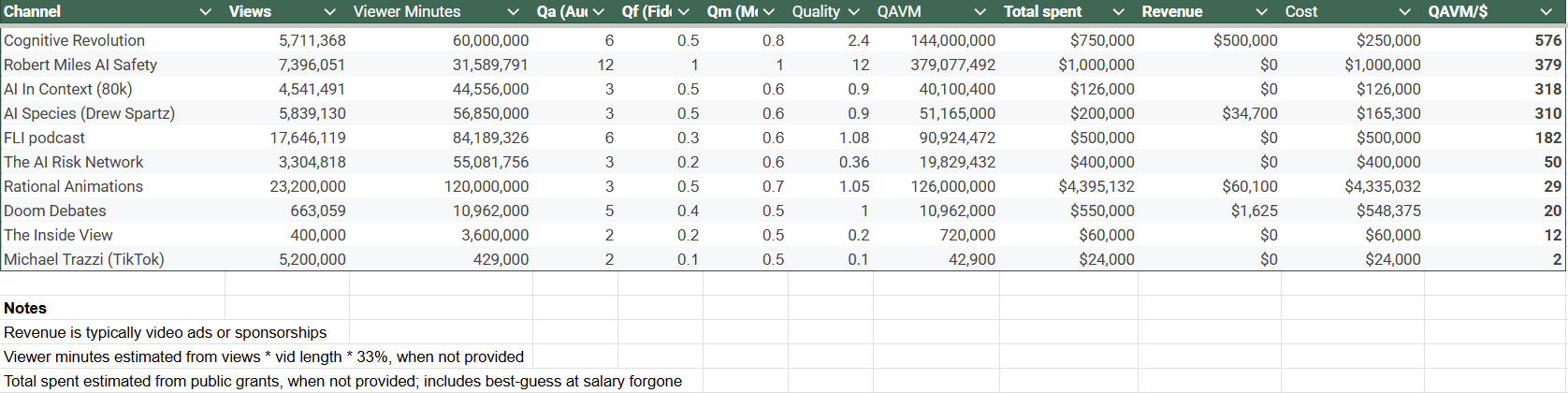 You say that the FLI podcast has 17M views and costed $500k. However, 17M is the amount of views on the overall FLI channel. If you look at the FLI podcast playlist and just add up the numbers you get something closer to 1M (calculation here). I’m assuming the $500k come from the podcast existing for 5 years and costing ~$100k / year? If so this does not include the three most viewed videos (that probably required a large budget) about slaughter bots and nuclear war (~12M of the 17M views). So really the google sheets should say 1M views, and the viewer minutes should be updated accordingly. (Except if they managed to produce all the slaughter bots / nuclear war stuff with a $500k budget).