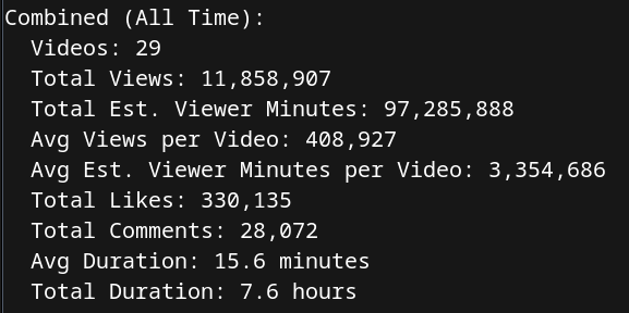 To calculate time spent watching videos, I first wrote a Python script to query the YouTube API for views and view lengths for every video in specific channels. I multiplied these, and adjusted by a factor for the average percentage of a video watched: 33%, based on conversations with creators. I also messaged creators asking them for their numbers, using those directly where possible. For any creators that responded, I included their metrics (which were usually screenshotted, for authenticity).