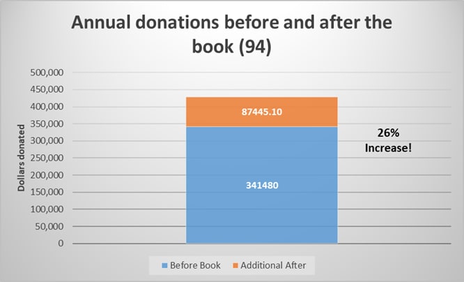 The largest number of respondents donated between $100 and $999 prior to reading the book. The overall total was $342,000, an average of $1,200 and a median annual donation of $100 (both including the $0 responses).