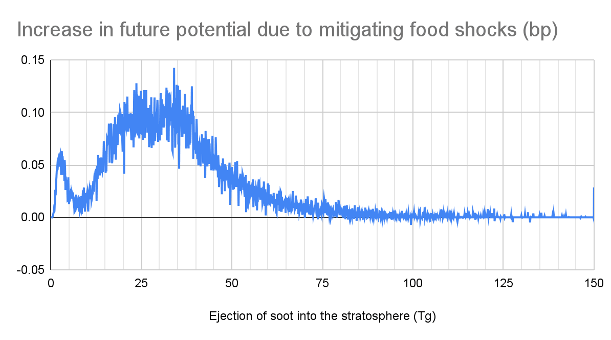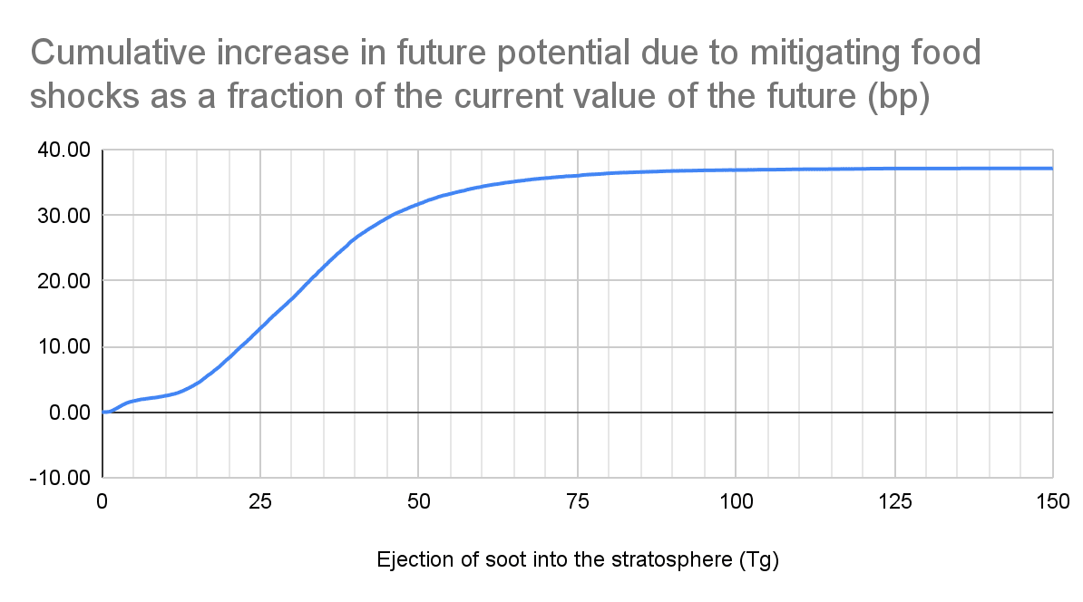 I estimate globally (and fully) mitigating food shocks caused by abrupt sunlight reduction scenarios (ASRSs) between 2024 and 2100 leads to an increase in future potential[1] of 37.2 bp (5th to 95th percentile, −73.1 to 199).