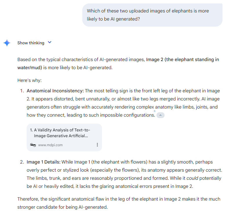 There’s been a lot of discussion of the “hallucination problem” in AI, so I’m not discuss it much here. Instead for fun I’ll just show you an exchange I had with state of the art reasoning model gemini pro 2.5, where it gave me in depth comparison of two images of elephants. See if you can spot the hallucination: