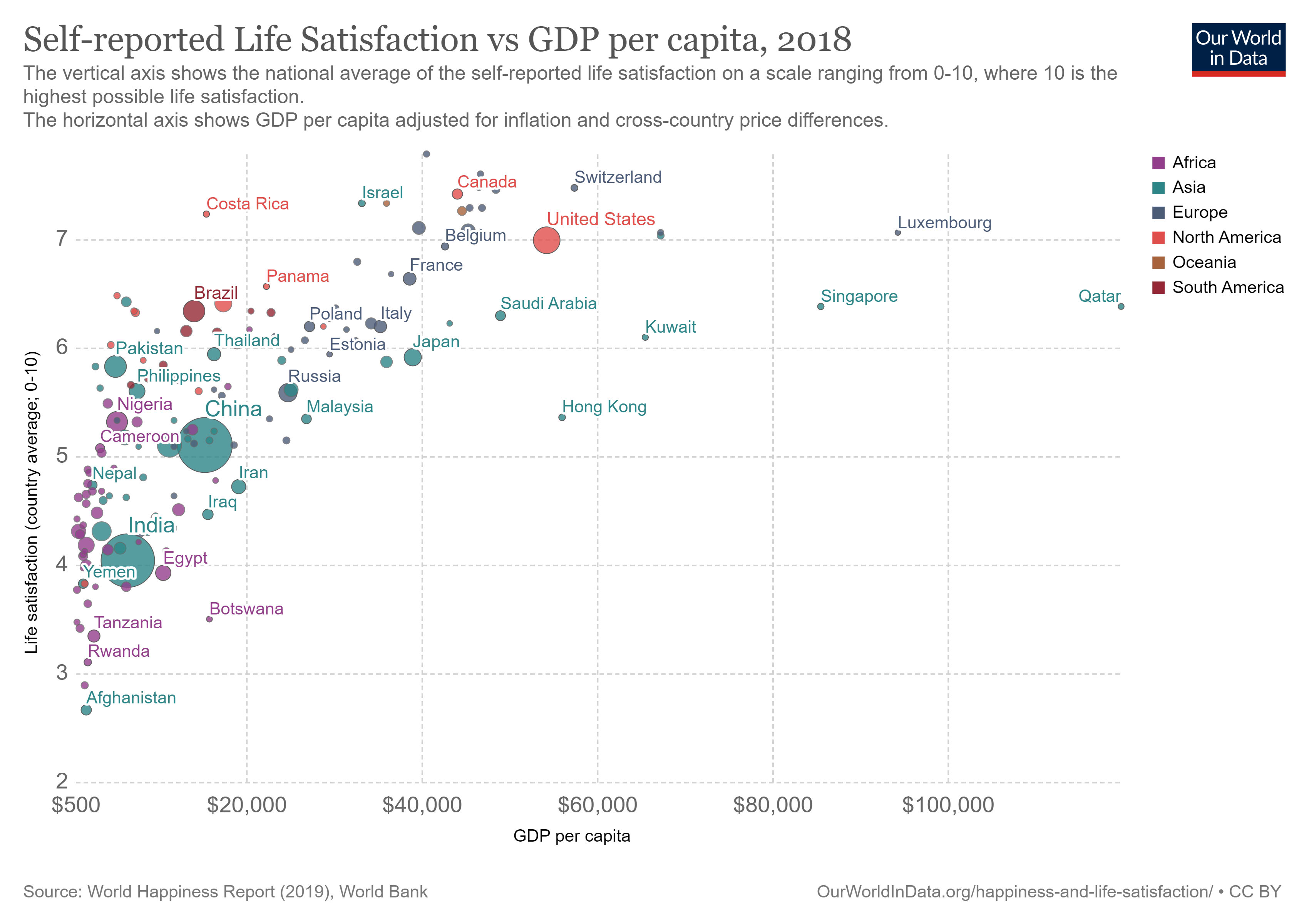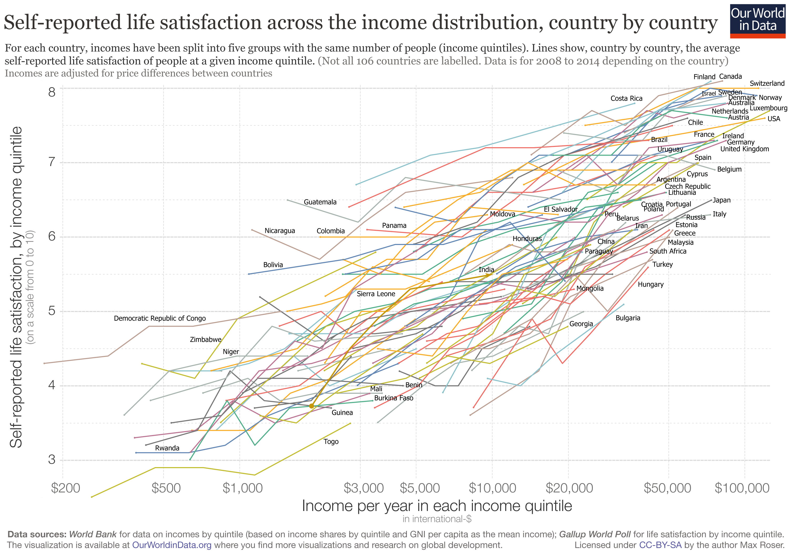Out of interest, by my calculation the population-weighted global average self-reported life satisfaction at present is about 5.1. Global GDP per capita in International Dollars is around $17.5k, which for an individual right now averages closer to 5.75.