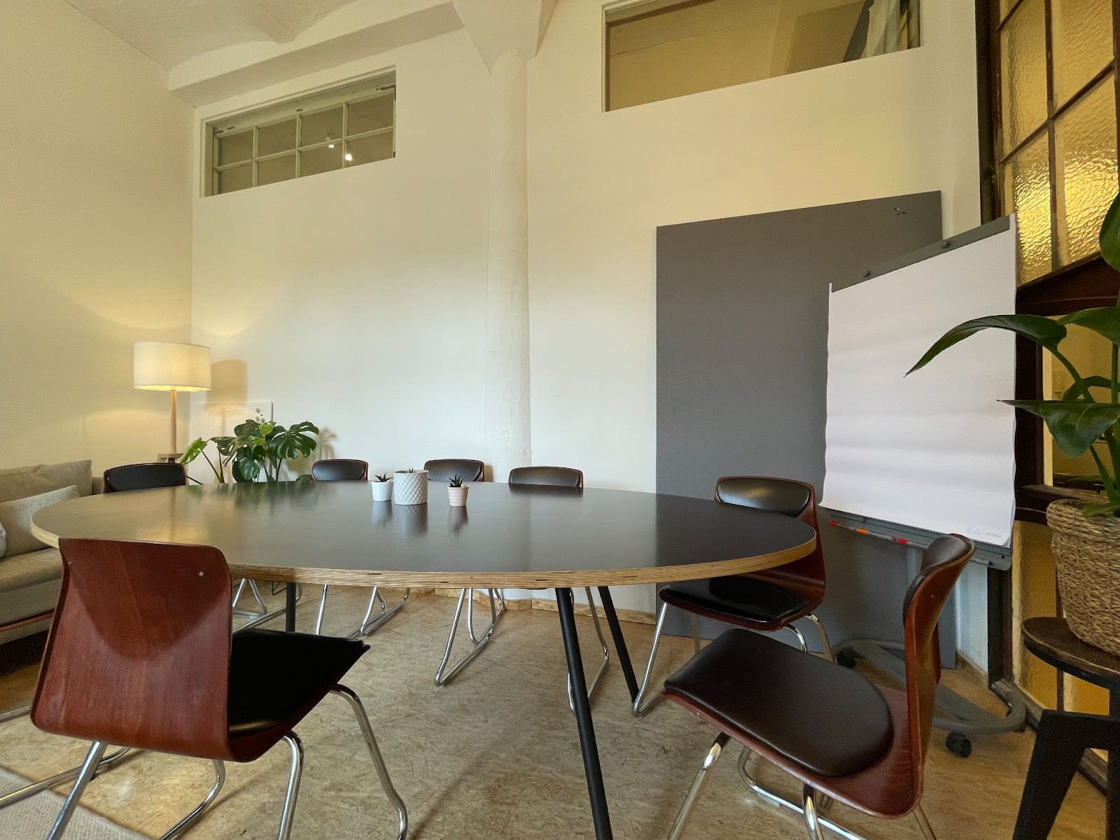 Workshop Room: “Flamingo Paradise” serves as a workshop room with a big sofa, a large desk, a flip chart, and a pin board. It can also be used as a small event space, complete with a portable projector. When not in use for events, it functions as a chill and social area.