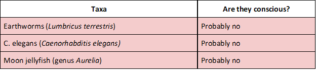 Finally, the fact that several organisms fall into the same category does not necessarily entail that the existing evidence for them is similar. There are cases in which our evidence for some taxa is stronger than for others, even in the same category. To better understand why a specific taxon falls into a given category, see our ‘Invertebrate Sentience Table’ and our Summary of findings Part 2, where it is further described which potentially consciousness-indicating features are found in each taxon.