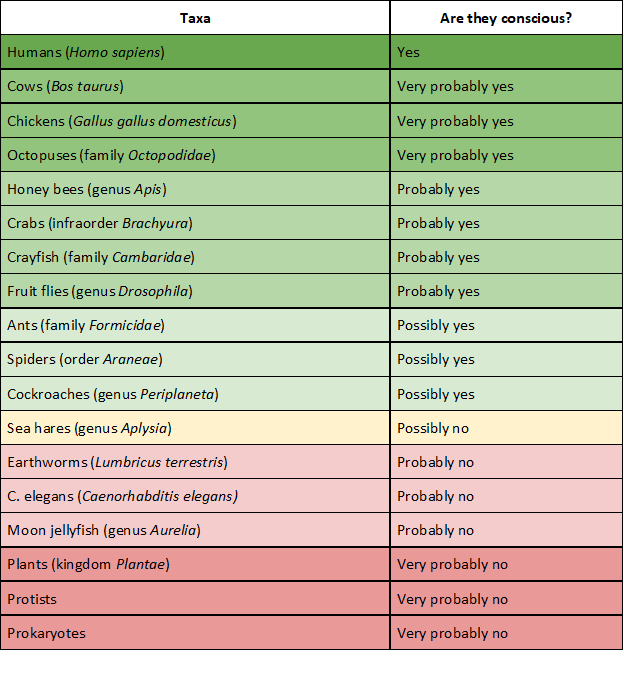 Given the current evidence I considered that it is probable that individuals of the following taxa are conscious:
