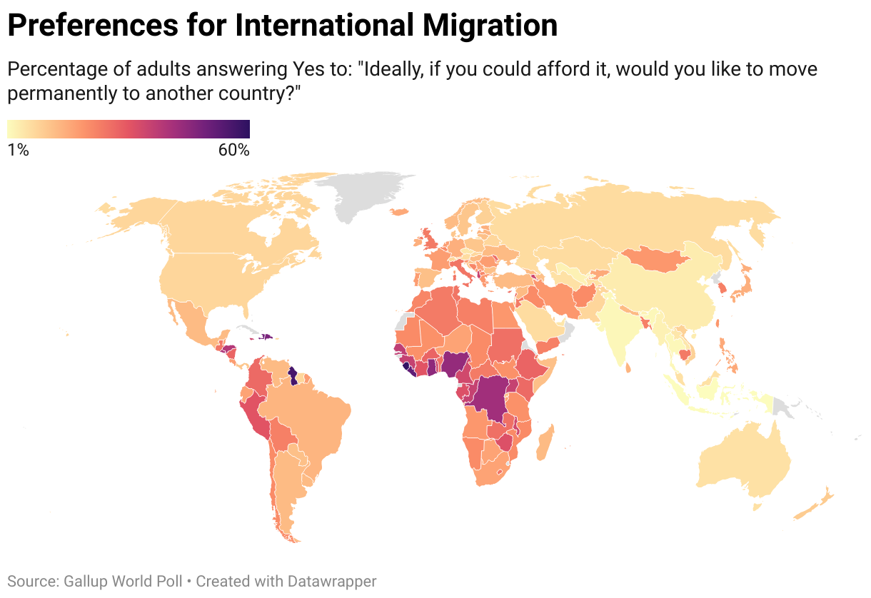 Two thirds of the world’s population live on less than $10 per day (Our World in Data), and 60% of the global variability in income is explained by where one is born (Milanovich, 2015). Perhaps as a result, many people want to permanently migrate to another country: in low-income countries, the share ranges from 20–59%; among Africans under 25, it is 33% (Gallup World Poll, own calculations; Figure 1).