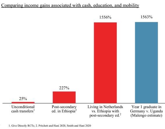 First, the actual comparison I want to see between Malengo & cash transfers is on a per-dollar basis. I’m confident that 12K of tuition is more welfare-improving than a $500 cash transfer. but is it 24X better? Thinking about this as a potential donor, that’s what I want to know. You can tease it out from the post, but is there a way to foreground the comparison?