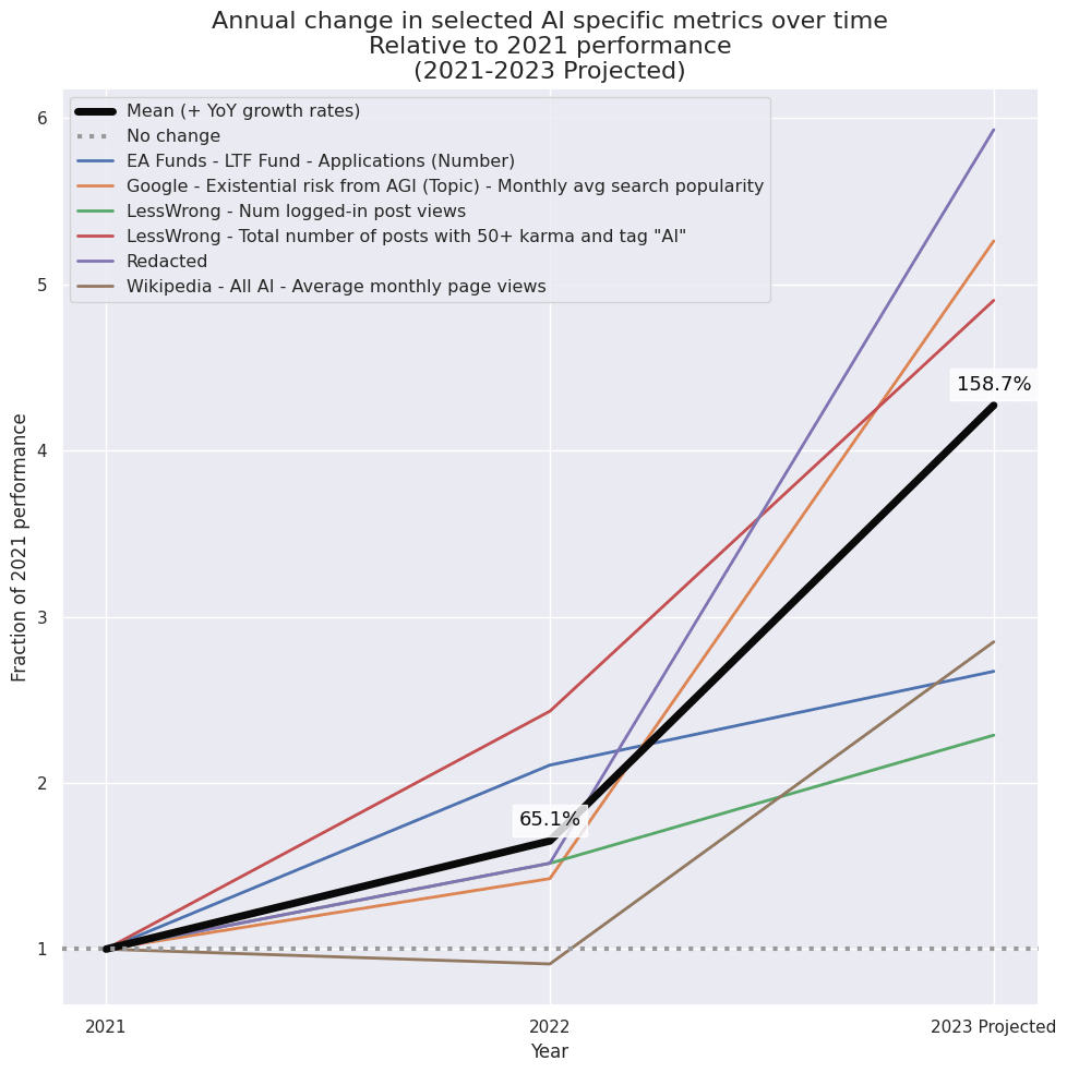 This chart shows how each metric has changed over time, after normalising all metrics to start at 1 in 2021. As you can see, in 2022 none of these metrics decreased, but in 2023 a couple of metrics started to fall.