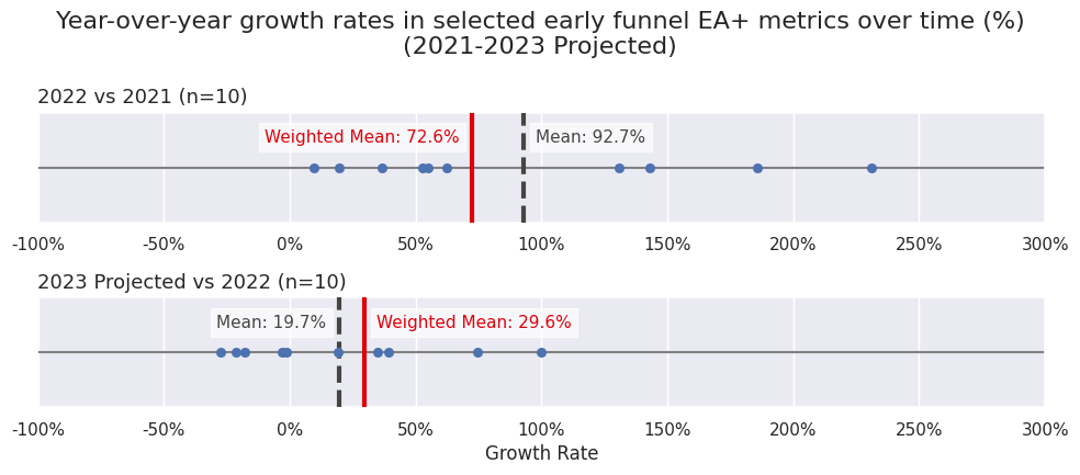 Mid funnel EA+ metrics are projected to grow by ~68% in 2023, compared to ~53% in 2022.