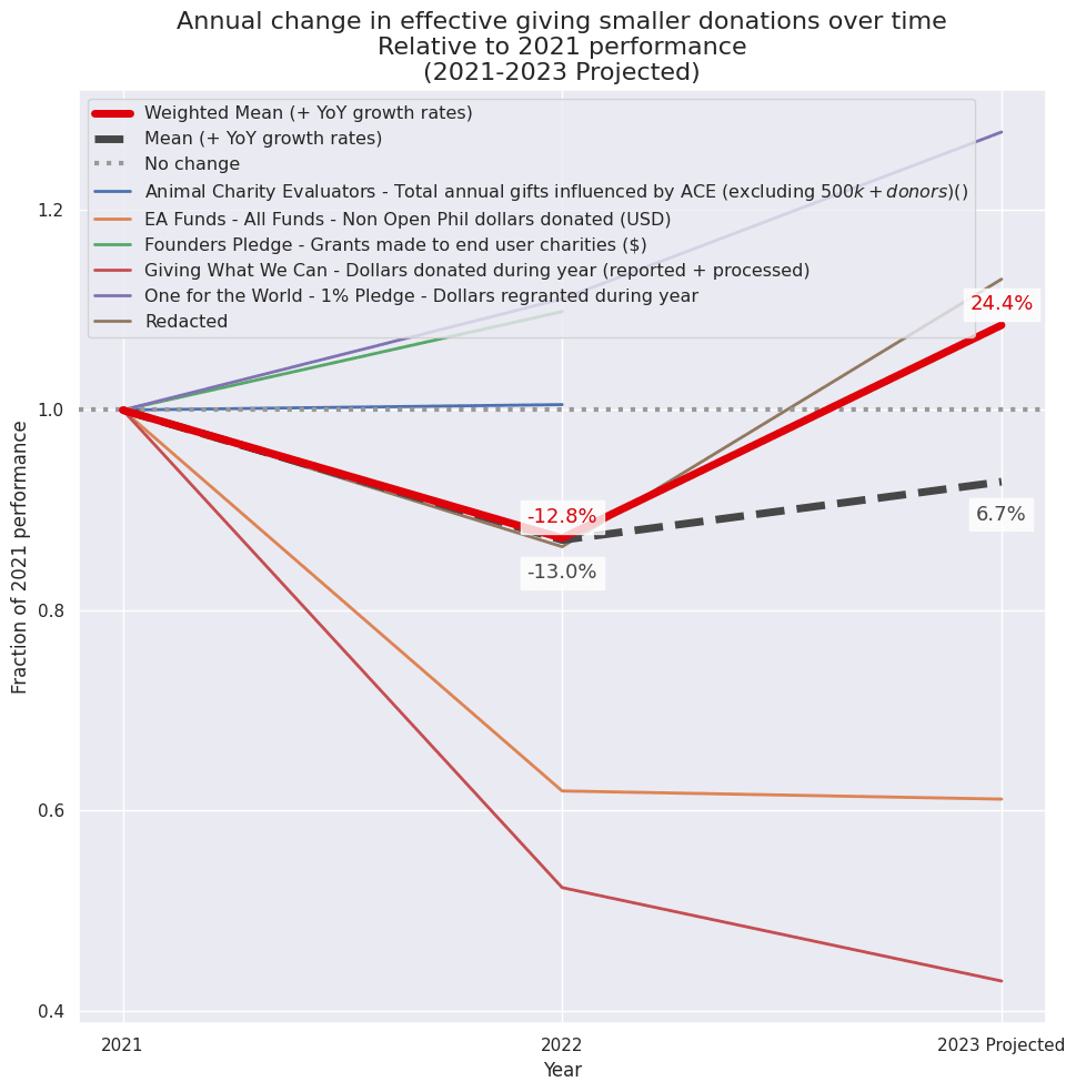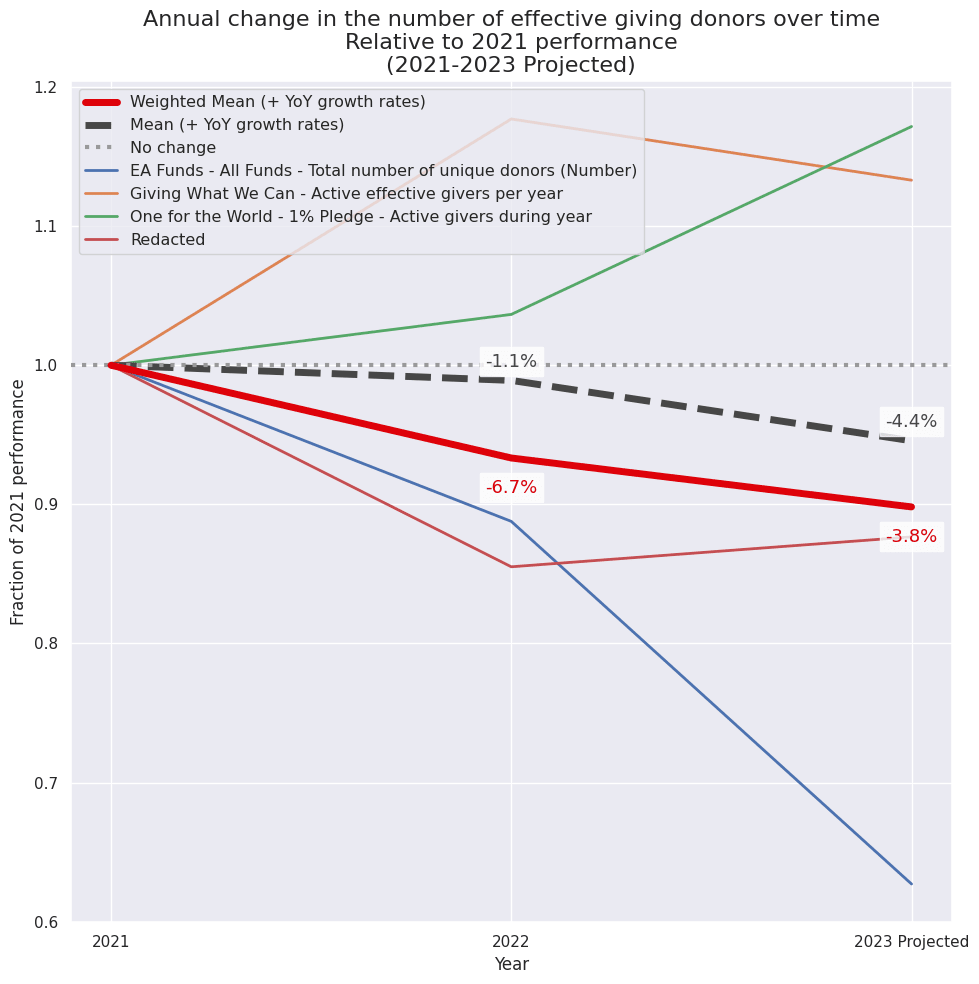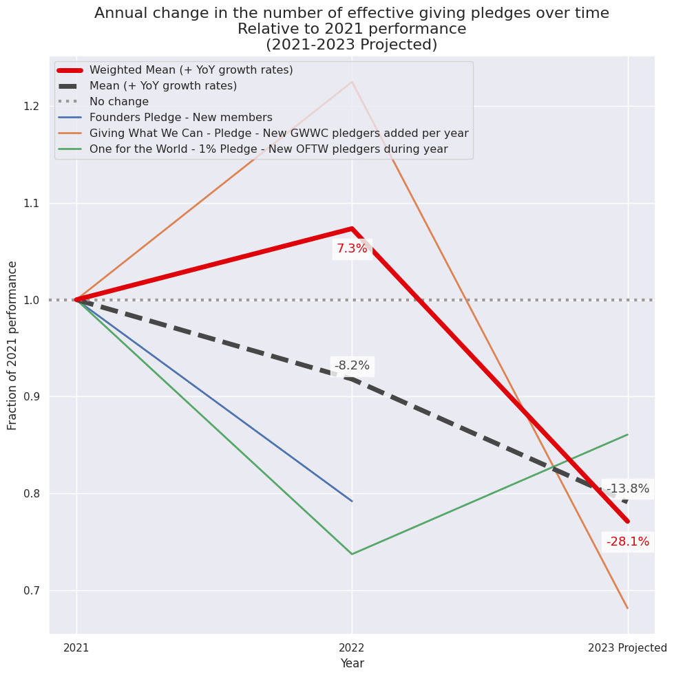 This is primarily tracking Giving What We Can’s number of new pledgers added this year, which I am projecting will fall by 44% in 2023, compared to increasing by 22% in 2022.