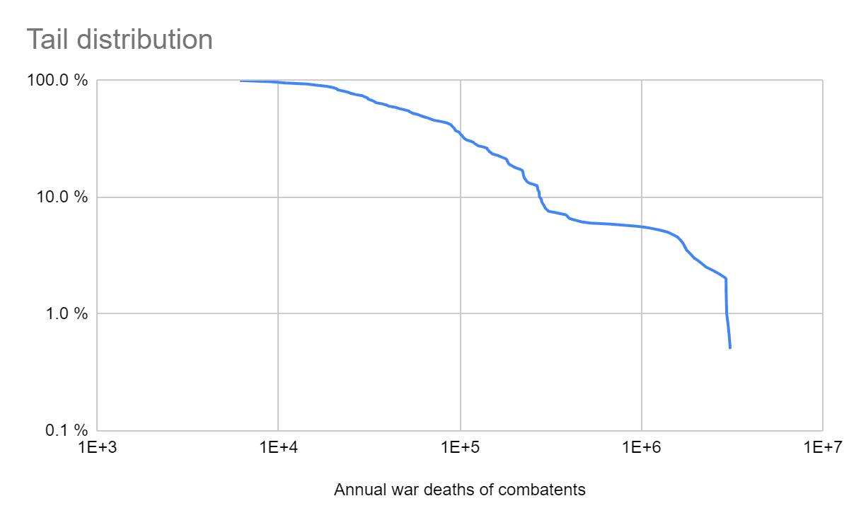 To investigate the above, I looked into historical annual war deaths along the lines of what I did in Can a terrorist attack cause human extinction? Not on priors, where I concluded the probability of a terrorist attack causing human extinction is astronomically low.