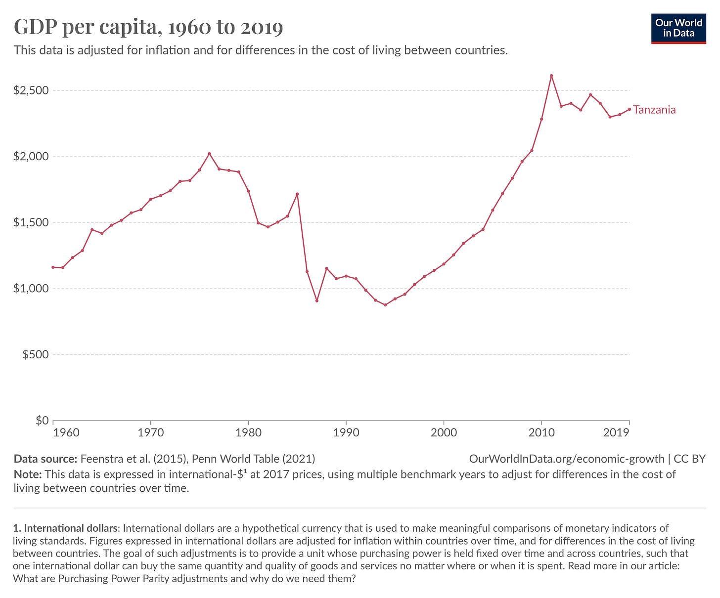 As ujamaa collapsed, the Tanzanian state atrophied, and economic activity retreated into the informal sector, with farmers switching from export to subsistence crops. But the GDP statistics largely missed this shift. In 1997, the GDP methodology was finally revised, using 1992 prices as a base. With this revision, the Bureau of Statistics admitted that GDP had previously been underestimated by anywhere between 30 and 200(!) percent.[1]
