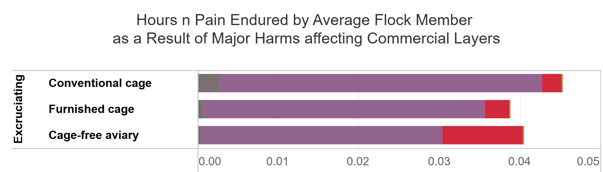 Additionally, as argued in the book, the estimates for Excruciating Pain were extremely conservative (i.e. Cumulative Pain in both cage systems is likely higher than estimated). We’ll have full estimates soon, once ‘The Welfare Footprint of the Egg’ is released.