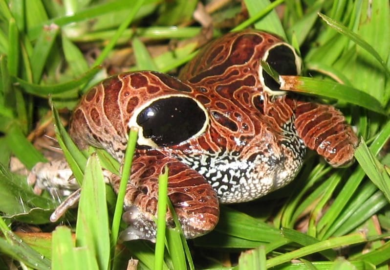 Eyespots on the rear end of Eupemphix nattereri frog. Photo by Felipe Gomes