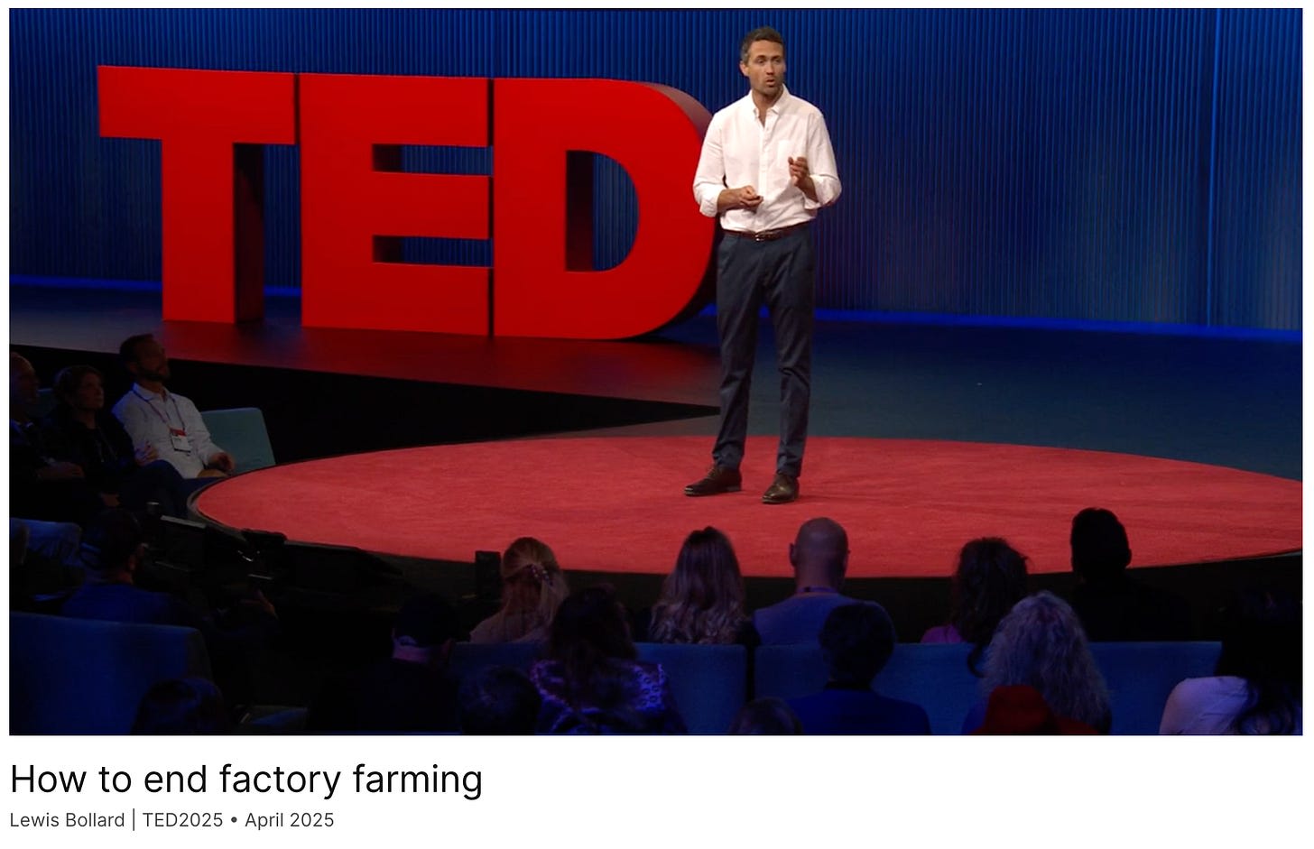 I listened to your talk, and it’s great to see this sort of topic getting real-estate on TED. The fact it wasn’t too preachy was well played, in my opinion. “Talk about factory farming.”—I like this message because it’s so unclear what one can even do outside of changing their diet, which is alienating to some.