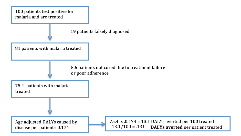 Our model accounts for the estimated false-diagnosis and treatment-failure rates to estimate DALYs averted per patient treated. We estimated these rates from relevant peer-reviewed literature. Based on the model for treatment of malaria in children under 5, each treatment averts on average .179 DALYs per patient treated: