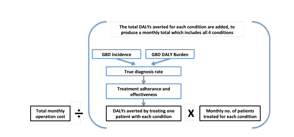 We then divide the total monthly operational cost by total DALYs averted, to find our cost per DALY averted.
